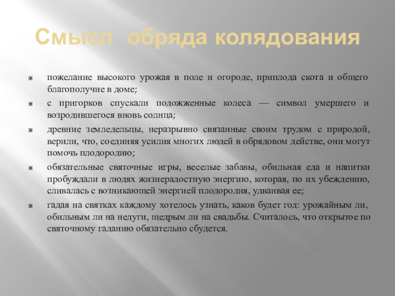 Песни-колядки славят Бога, в них звучат пожелания добра, богатства, они призывают нас жить в мире и счастье !