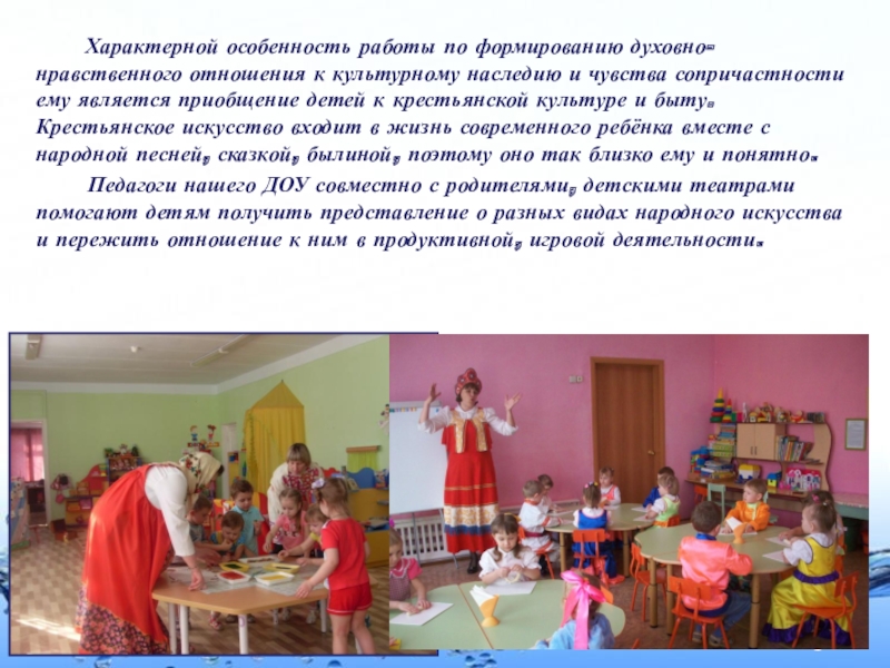 к культурному наследию и чувства сопричастности ему является приобщение детей к крестьянской культуре и быту. Крестьянское искусство входит в жизнь современного ребёнка вместе с народной песней, сказкой, былиной, поэтому оно так близко ему и понятно.