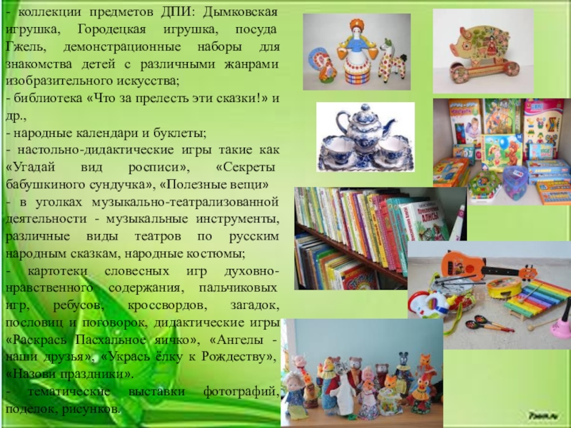 Слайд 17- коллекции предметов ДПИ: Дымковская игрушка, Городецкая игрушка, посуда Гжель, демонстрационные