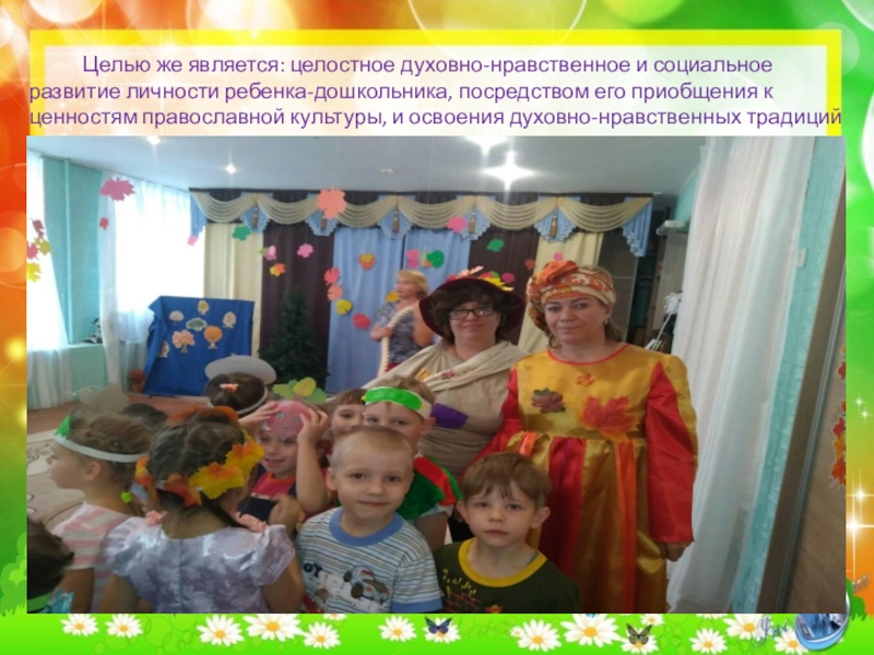 социальное развитие личности ребенка-дошкольника, посредством его приобщения к ценностям православной культуры, и освоения духовно-нравственных традиций русского народа.