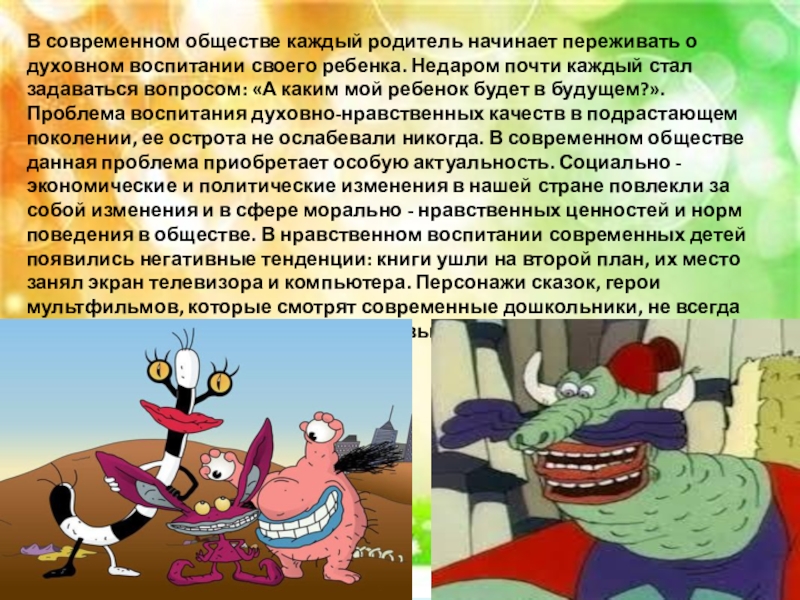 ребенка. Недаром почти каждый стал задаваться вопросом: «А каким мой ребенок будет в будущем?». Проблема воспитания духовно-нравственных качеств в подрастающем поколении, ее острота не ослабевали никогда. В современном обществе данная проблема приобретает особую актуальность. Социально - экономические и политические изменения в нашей стране повлекли за собой изменения и в сфере морально - нравственных ценностей и норм поведения в обществе. В нравственном воспитании современных детей появились негативные тенденции: книги ушли на второй план, их место занял экран телевизора и компьютера. Персонажи сказок, герои мультфильмов, которые смотрят современные дошкольники, не всегда отличаются нравственной чистотой и высокой духовностью.
