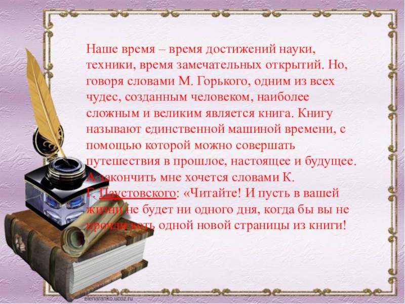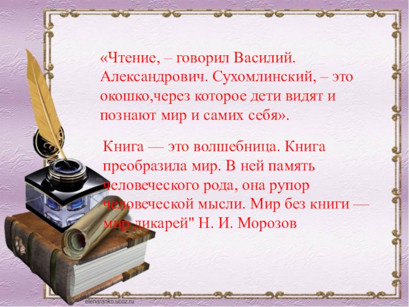 Книга — это волшебница. Книга преобразила мир. В ней память человеческого рода, она рупор человеческой мысли. Мир без книги — мир дикарей" Н. И. Морозов