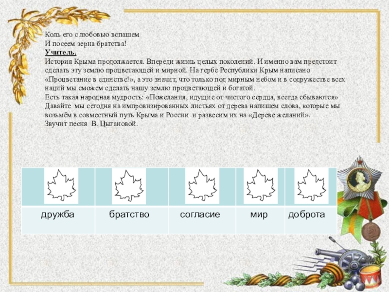 Есть такая народная мудрость: «Пожелания, идущие от чистого сердца, всегда сбываются» Давайте мы сегодня на импровизированных листьях от дерева напишем слова, которые мы возьмём в совместный путь Крыма и России и развесим их на «Дереве желаний».