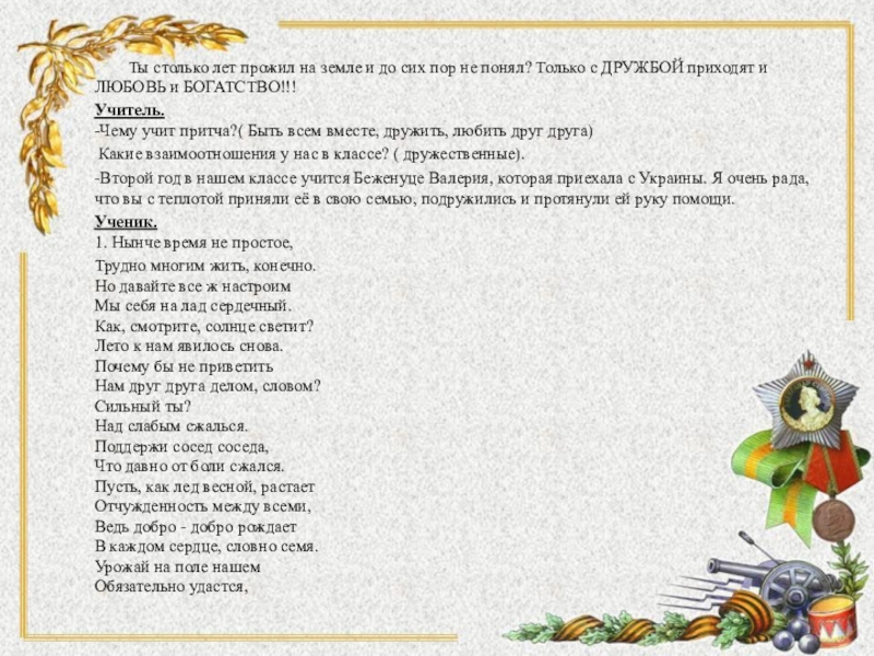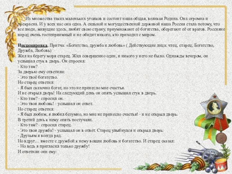 Инсценировка. Притча: «Богатство, дружба и любовь» ( Действующие лица: чтец, старец, Богатство, Дружба, Любовь)