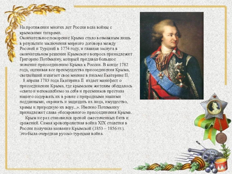 8 апреля 1783 года Екатерина II издает манифест о присоединении Крыма, где крымским жителям обещалось «свято и непоколебимо за себя и преемников престола нашего содержать их в ровне с природными нашими подданными, охранять и защищать их лица, имущество, храмы и природную их веру...». Именно Потемкину принадлежит слава «бескровного» присоединения Крыма.