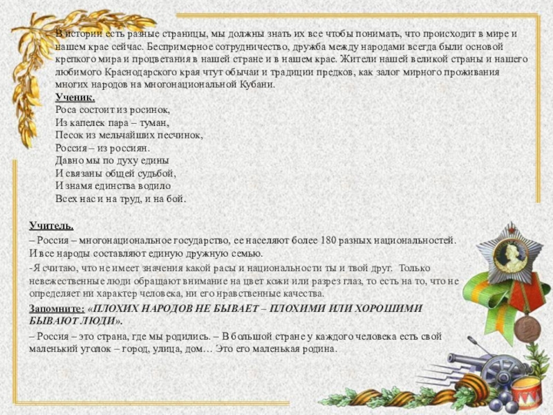 понимать, что происходит в мире и нашем крае сейчас. Беспримерное сотрудничество, дружба между народами всегда были основой крепкого мира и процветания в нашей стране и в нашем крае. Жители нашей великой страны и нашего любимого Краснодарского края чтут обычаи и традиции предков, как залог мирного проживания многих народов на многонациональной Кубани.