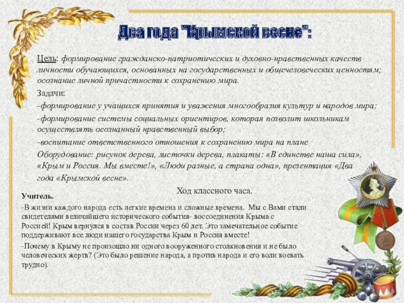Оборудование: рисунок дерева, листочки дерева, плакаты: «В единстве наша сила», «Крым и Россия. Мы вместе!», «Люди разные, а страна одна», презентация «Два