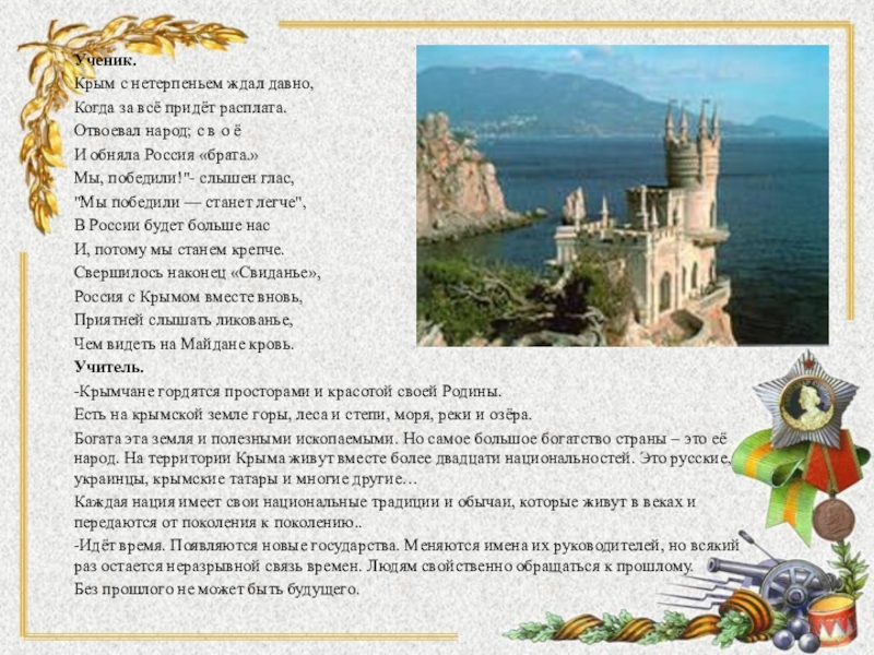 жизнь целых поколений. И именно вам предстоит сделать эту землю процветающей и мирной. На гербе Республики Крым написано «Процветание в единстве!», а это значит, что только под мирным небом и в содружестве всех наций мы сможем сделать нашу землю процветающей и богатой.