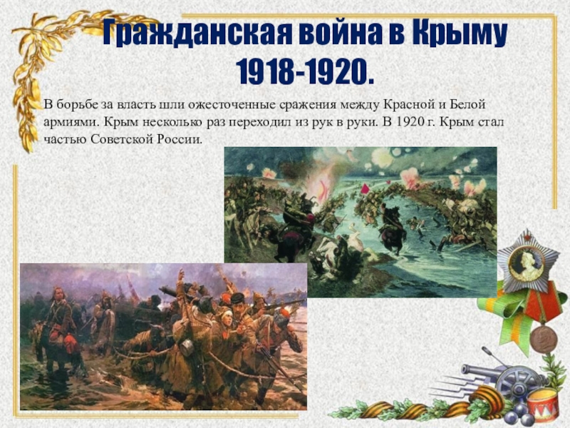 Красной и Белой армиями. Крым несколько раз переходил из рук в руки. В 1920 г. Крым стал частью Советской России.