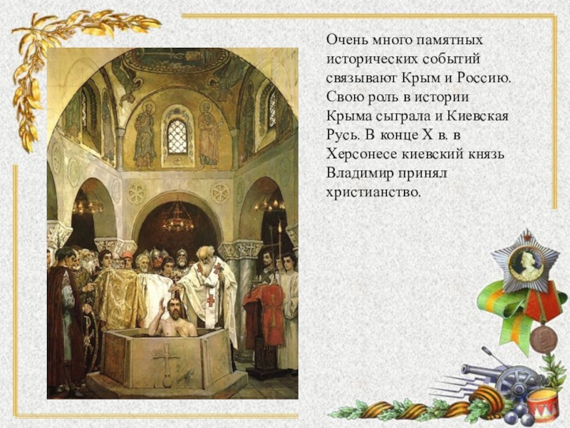 в истории Крыма сыграла и Киевская Русь. В конце Х в. в Херсонесе киевский князь Владимир принял христианство.