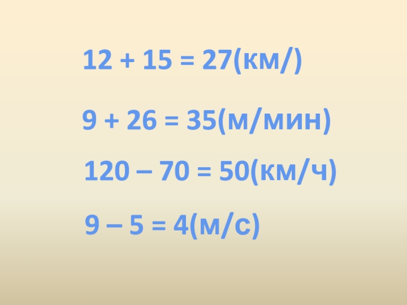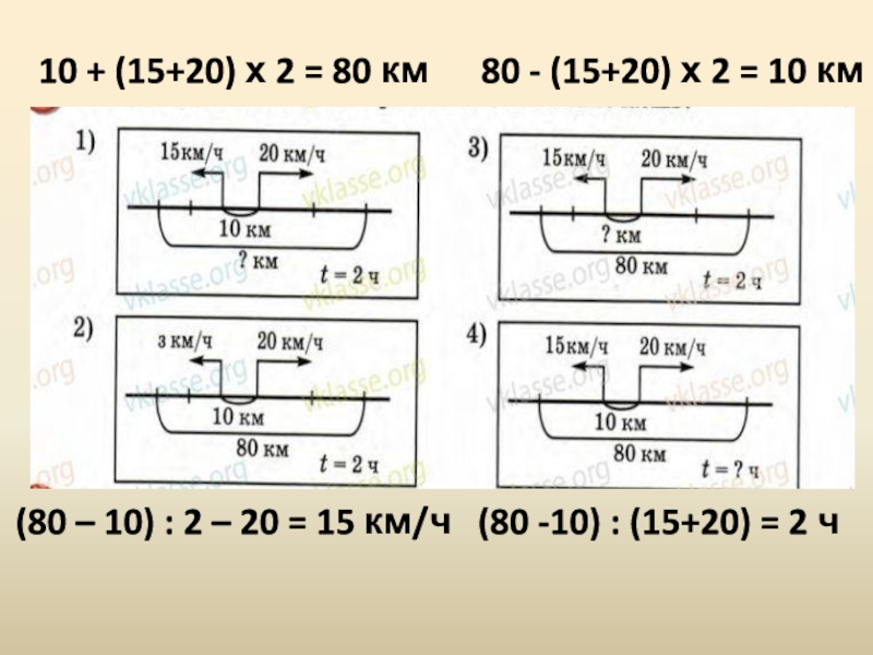(80 – 10) : 2 – 20 = 15 км/ч (80 -10) : (15+20) = 2 ч