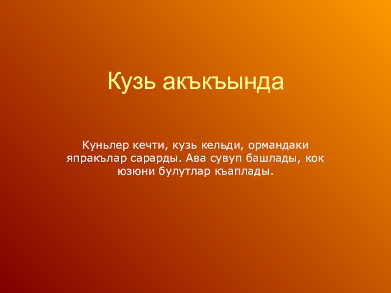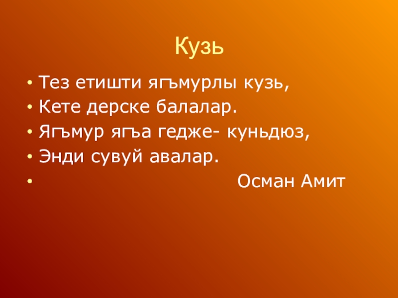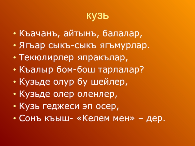 кузьКъачанъ, айтынъ, балалар,Ягъар сыкъ-сыкъ ягъмурлар.Текюлирлер япракълар, Къалыр бом-бош тарлалар?Кузьде олур бу шейлер,Кузьде олер оленлер,Кузь геджеси эп осер,Сонъ къыш- «Келем мен» – дер.