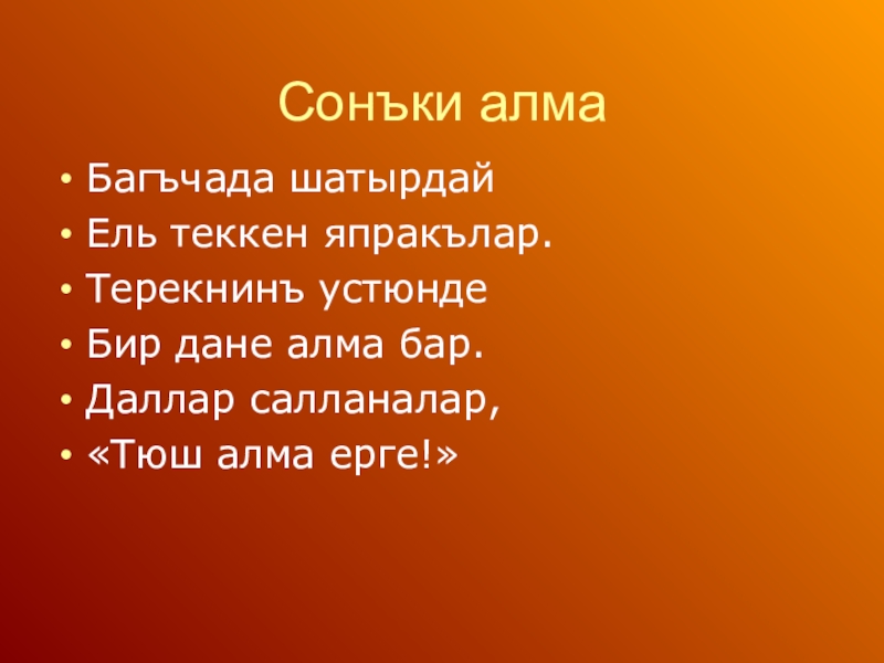 Сонъки алмаБагъчада шатырдайЕль теккен япракълар.Терекнинъ устюндеБир дане алма бар.Даллар салланалар,«Тюш алма ерге!»
