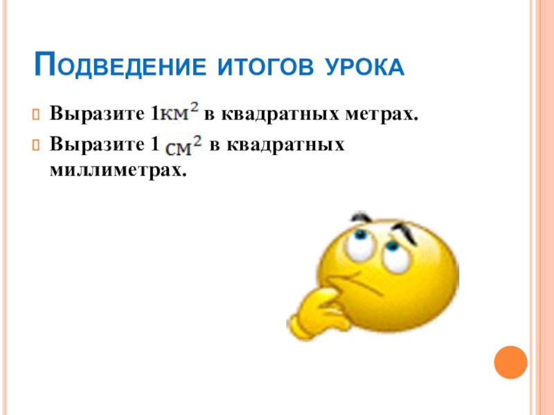 Подведение итогов урокаВыразите 1    в квадратных метрах.Выразите 1     в квадратных
