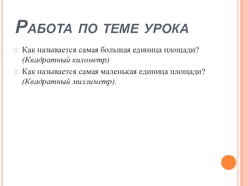 Работа по теме урокаКак называется самая большая единица площади? (Квадратный километр)Как называется самая маленькая единица площади? (Квадратный