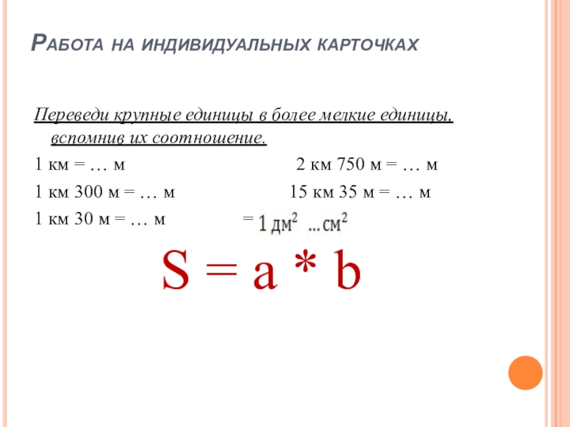 Работа на индивидуальных карточках Переведи крупные единицы в более мелкие единицы, вспомнив их соотношение.1 км = …