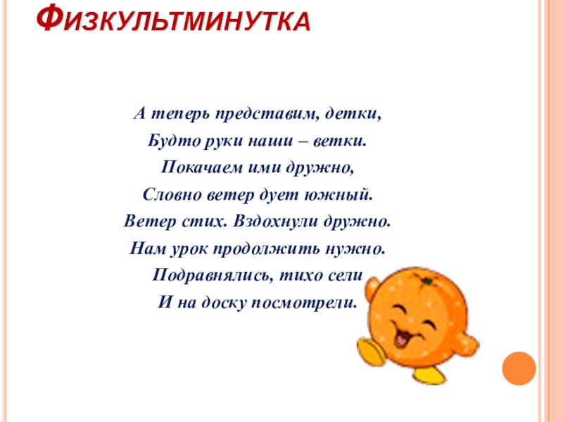 Физкультминутка А теперь представим, детки,Будто руки наши – ветки.Покачаем ими дружно,Словно ветер дует южный.Ветер стих. Вздохнули дружно.Нам