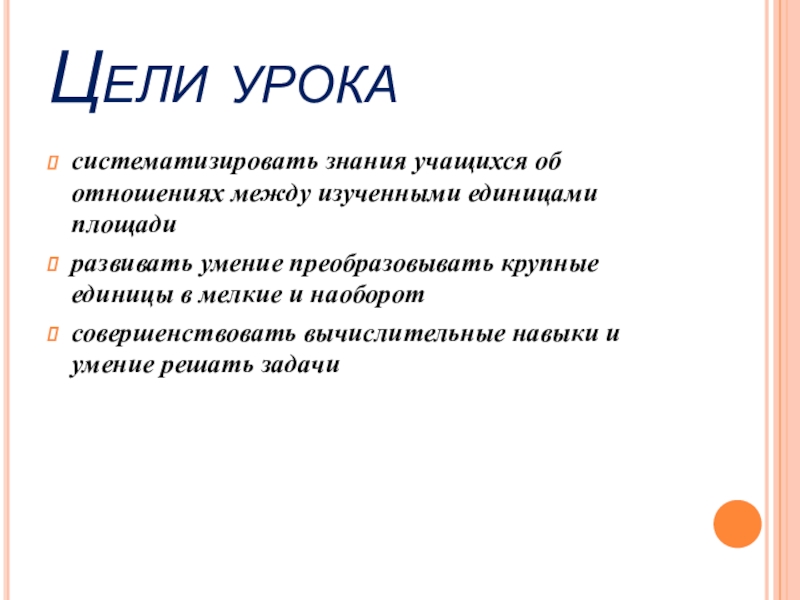 Цели урокасистематизировать знания учащихся об отношениях между изученными единицами площадиразвивать умение преобразовывать крупные единицы в мелкие и наоборотсовершенствовать вычислительные навыки и умение решать задачи