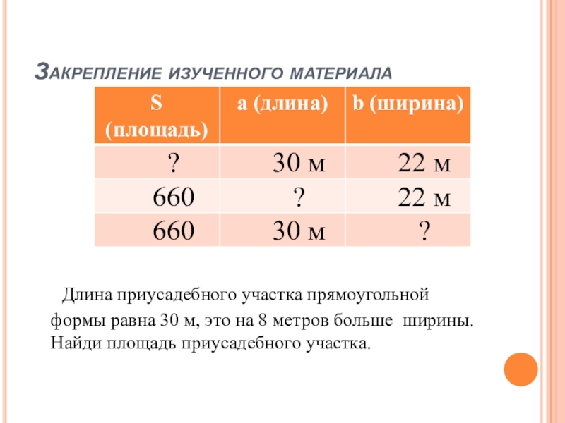 Закрепление изученного материалаРабота над задачами		Длина приусадебного участка прямоугольной формы равна 30 м, это на 8 метров больше