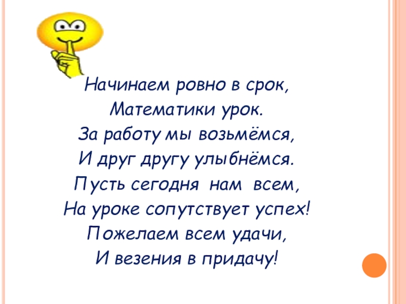 Начинаем ровно в срок,Математики урок.За работу мы возьмёмся,И друг другу улыбнёмся.Пусть сегодня нам всем,На уроке сопутствует успех!Пожелаем