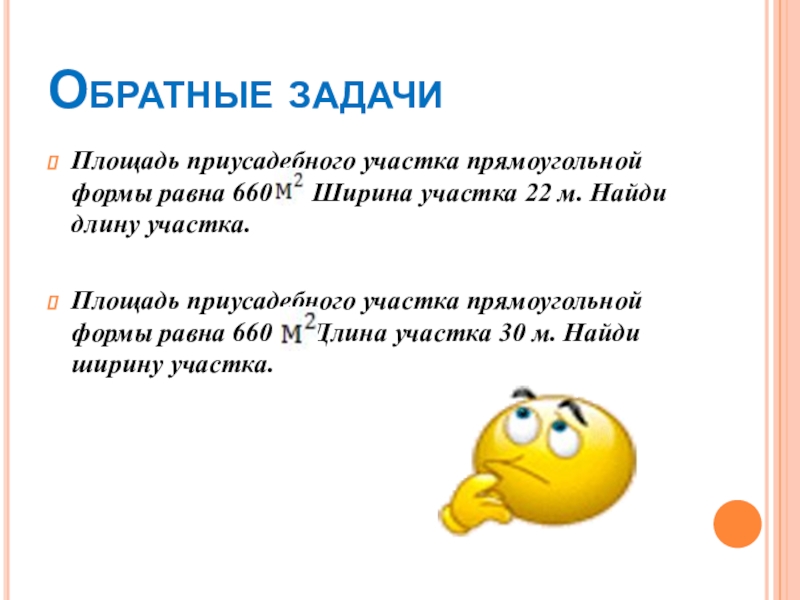 Обратные задачиПлощадь приусадебного участка прямоугольной формы равна 660   Ширина участка 22 м. Найди длину участка.