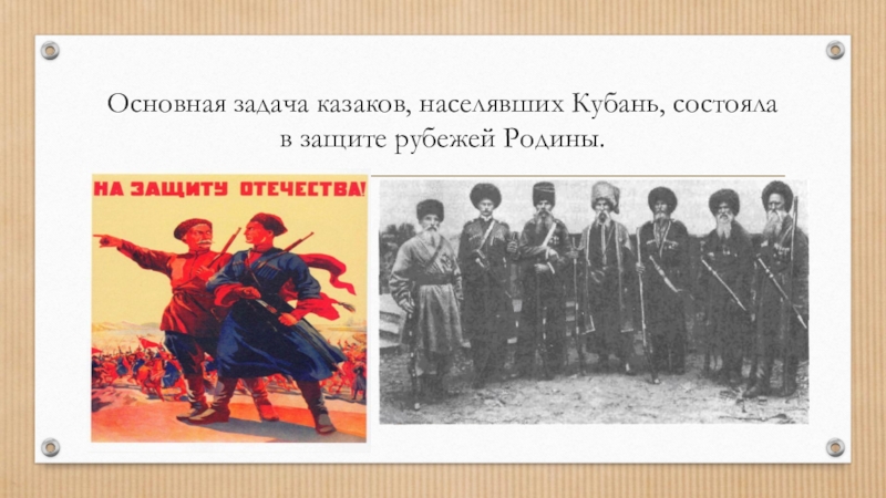 Слайд 18Основная задача казаков, населявших Кубань, состояла в защите рубежей Родины.