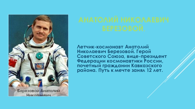 Летчик-космонавт Анатолий Николаевич Березовой. Герой Советского Союза, вице-президент
