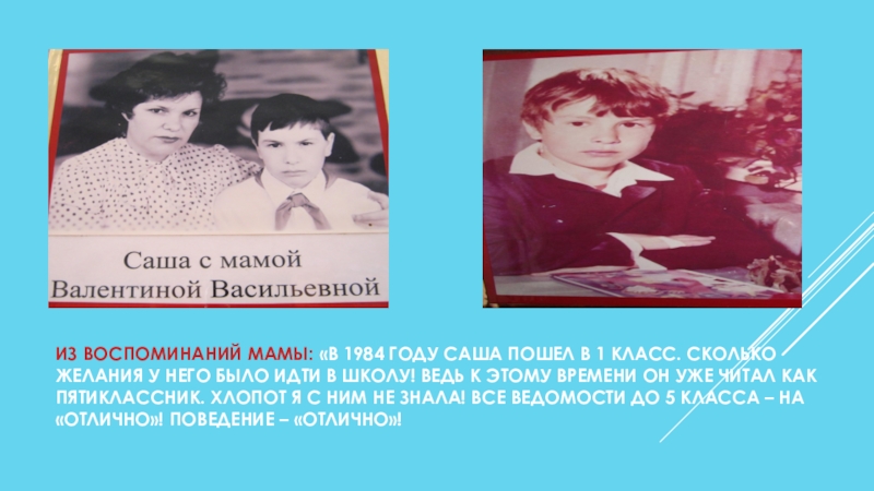 Слайд 11ИЗ ВОСПОМИНАНИЙ МАМЫ: «В 1984 ГОДУ САША ПОШЕЛ В 1 КЛАСС.