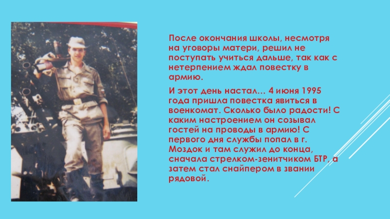 И этот день настал… 4 июня 1995 года пришла повестка явиться в военкомат. Сколько было радости! С каким настроением он созывал гостей на проводы в армию! С первого дня службы попал в г. Моздок и там служил до конца, сначала стрелком-зенитчиком БТР, а затем стал снайпером в звании рядовой.