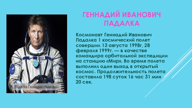 Космонавт Геннадий Иванович Падалка 1 космический полет совершил