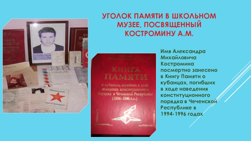 Слайд 15УГОЛОК ПАМЯТИ В ШКОЛЬНОМ МУЗЕЕ, ПОСВЯЩЕННЫЙ КОСТРОМИНУ А.М.
