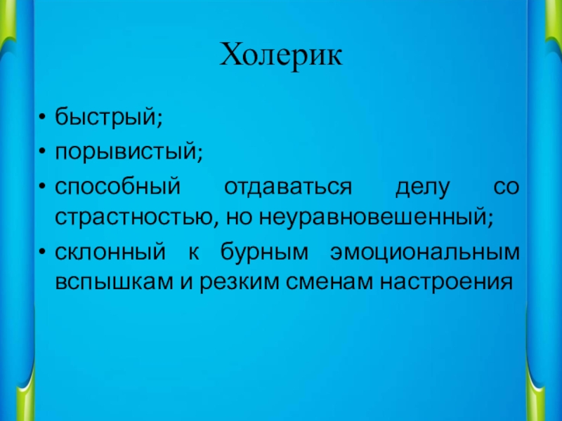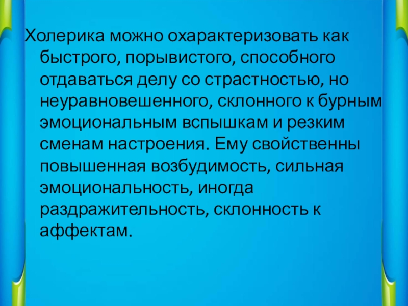 Слайд 7Холерика можно охарактеризовать как быстрого, порывистого, способного отдаваться делу со страстностью,