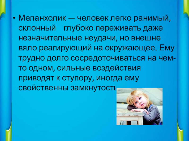 Слайд 9Меланхолик — человек легко ранимый, склонный глубоко переживать даже