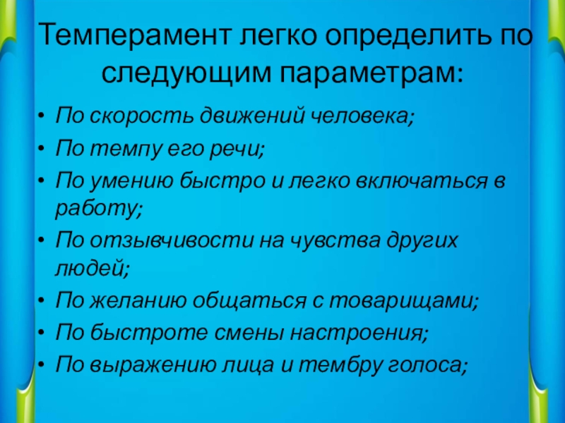 Слайд 3Темперамент легко определить по следующим параметрам: