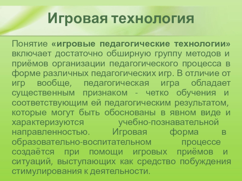приёмов организации педагогического процесса в форме различных педагогических игр. В отличие от игр вообще, педагогическая игра обладает существенным признаком - четко обучения и соответствующим ей педагогическим результатом, которые могут быть обоснованы в явном виде и характеризуются учебно-познавательной направленностью. Игровая форма в образовательно-воспитательном процессе создаётся при помощи игровых приёмов и ситуаций, выступающих как средство побуждения стимулирования к деятельности.