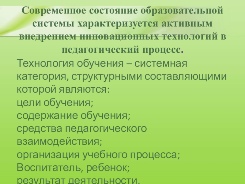 Технология обучения – системная категория, структурными составляющими которой являются:
