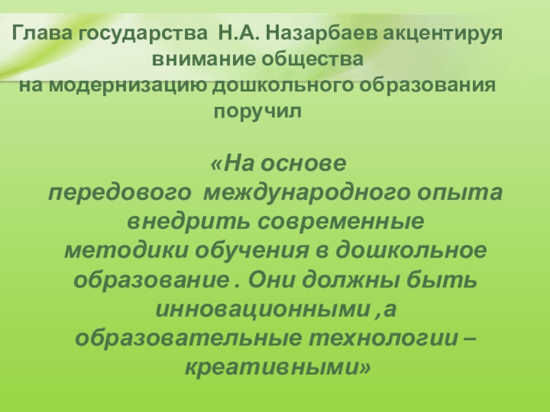 Слайд 2Глава государства Н.А. Назарбаев акцентируя внимание общества