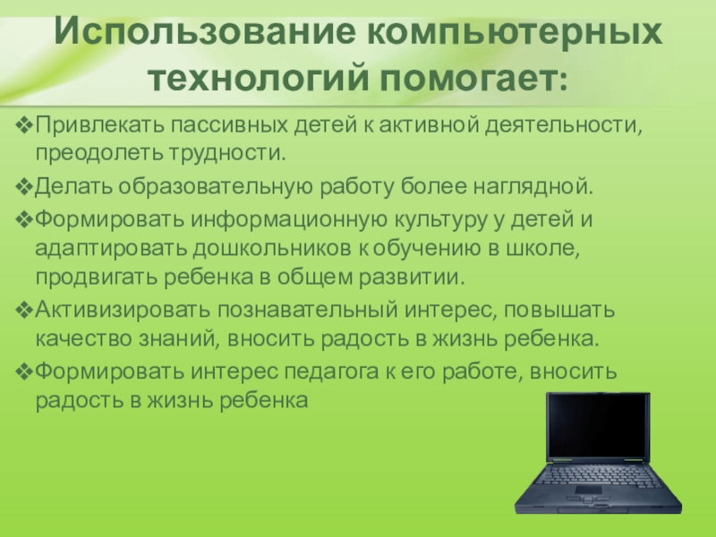 Слайд 45Использование компьютерных технологий помогает: