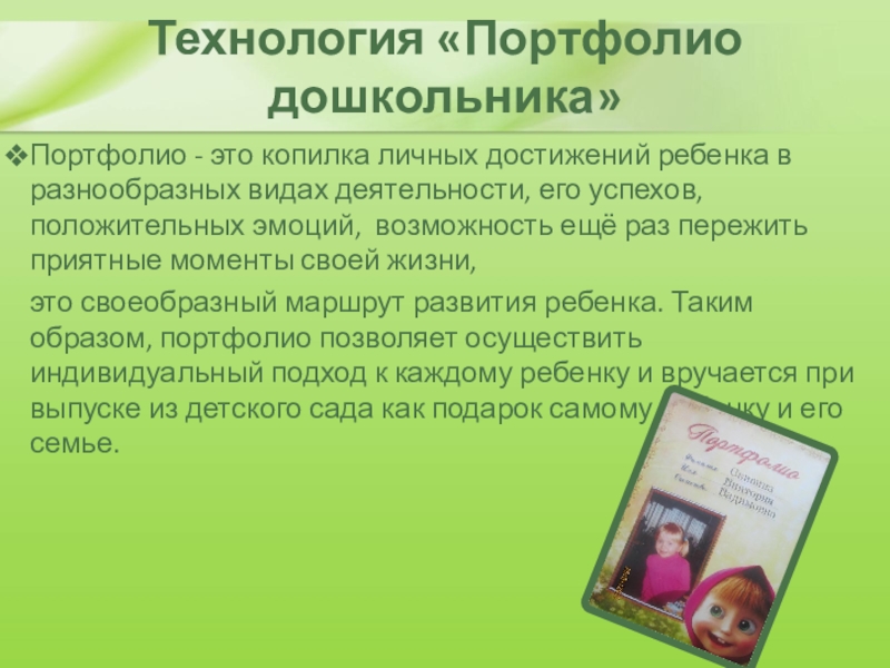 это своеобразный маршрут развития ребенка. Таким образом, портфолио позволяет осуществить индивидуальный подход к каждому ребенку и вручается при выпуске из детского сада как подарок самому ребенку и его семье.