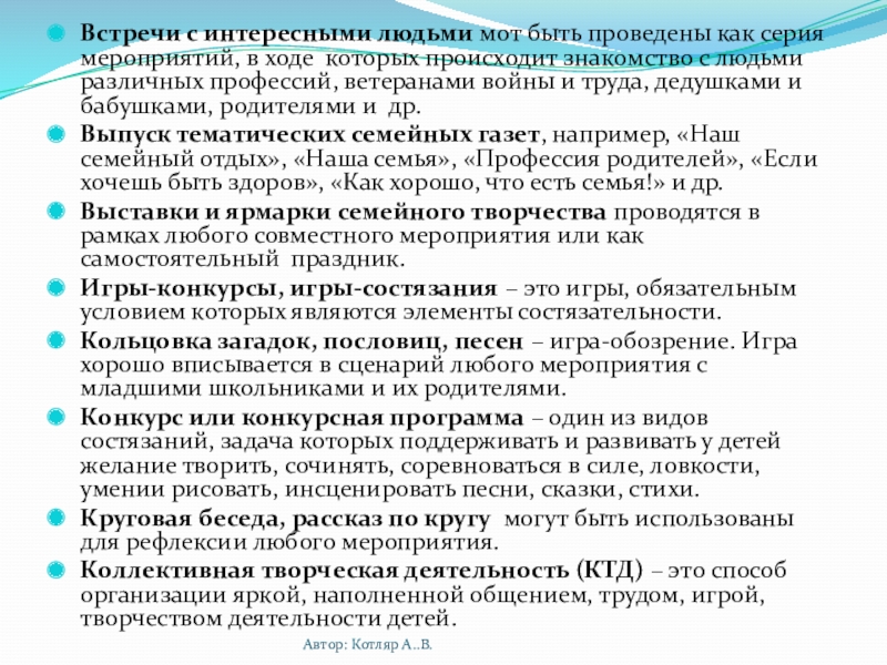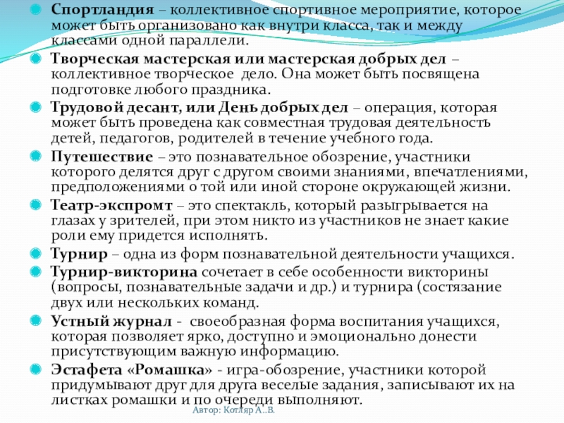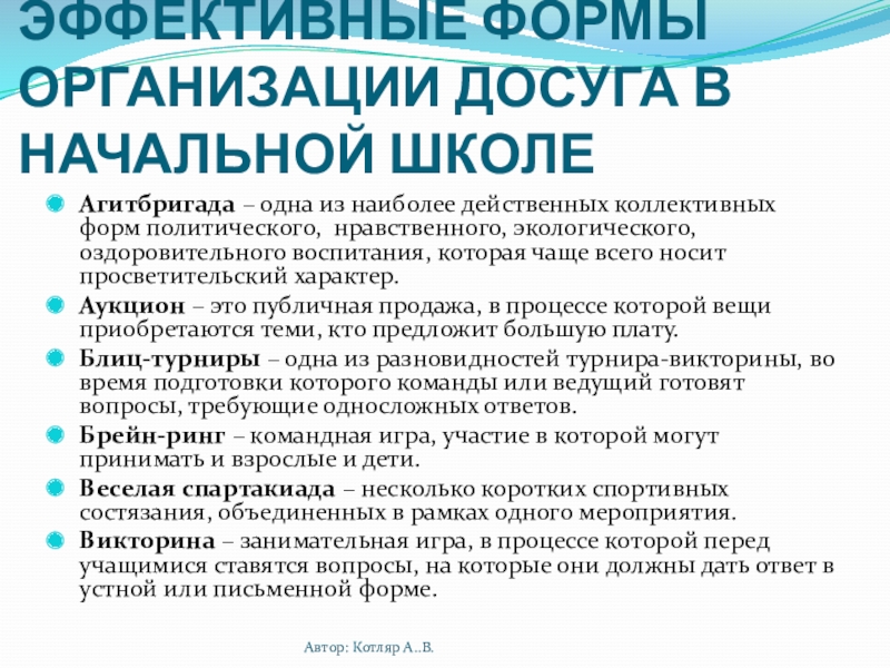 организованный (педагогически целесообразно используемое свободное время) и стихийный (спонтанно протекающий процесс использования ребенком свободного времени);