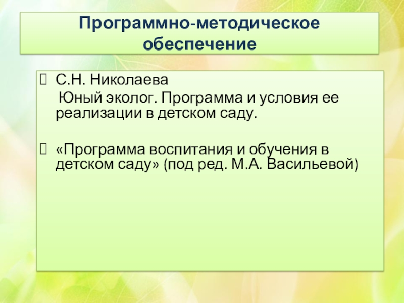Программно-методическое обеспечениеС.Н. Николаева Юный эколог. Программа и условия ее реализации в детском саду.«Программа воспитания и обучения в детском саду» (под ред. М.А. Васильевой)