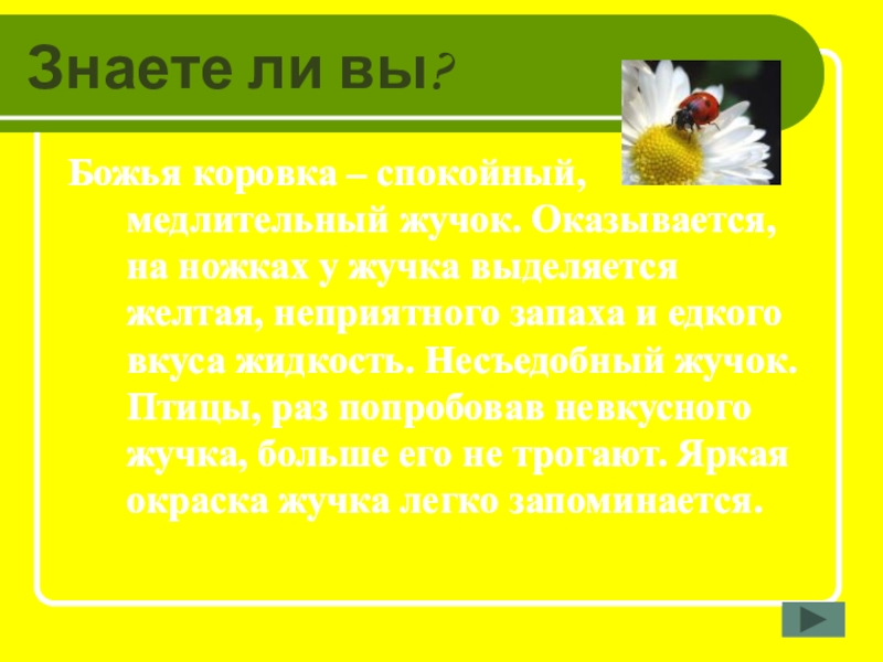 Знаете ли вы?Божья коровка – спокойный, медлительный жучок. Оказывается, на ножках у жучка выделяется желтая, неприятного запаха