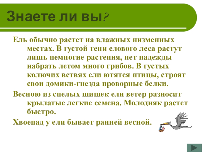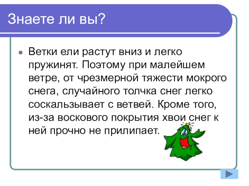 Знаете ли вы?Ветки ели растут вниз и легко пружинят. Поэтому при малейшем ветре, от чрезмерной тяжести мокрого
