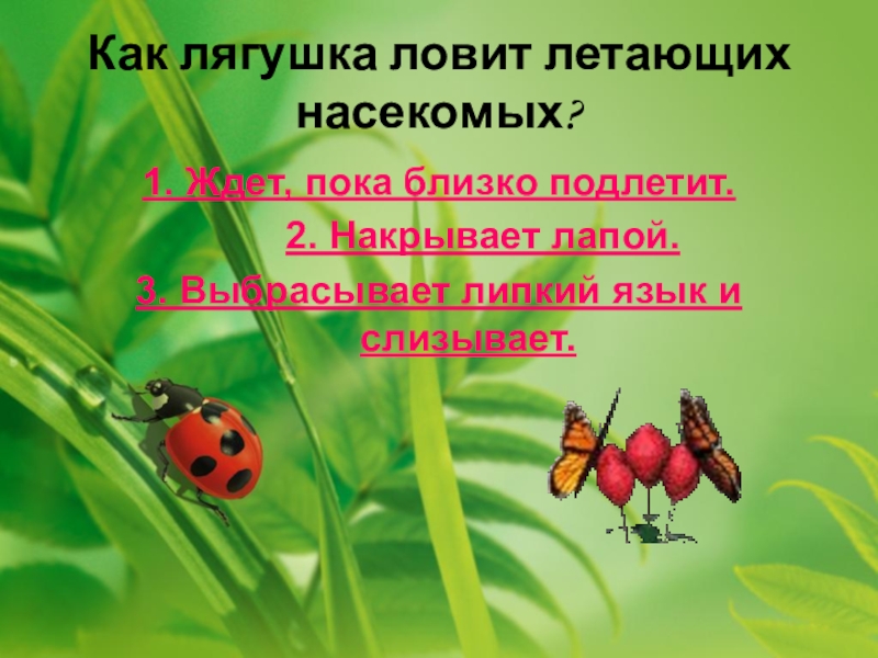 Слайд 28Как лягушка ловит летающих насекомых?
