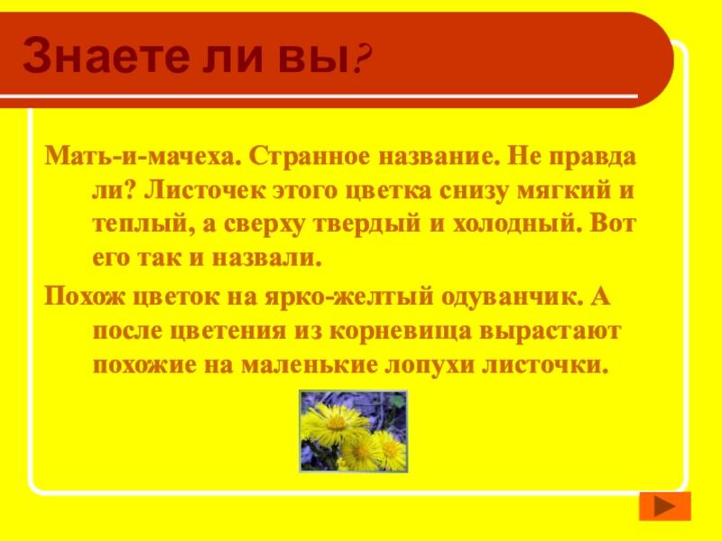 Знаете ли вы?Мать-и-мачеха. Странное название. Не правда ли? Листочек этого цветка снизу мягкий и теплый, а сверху