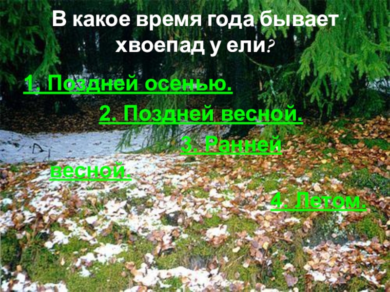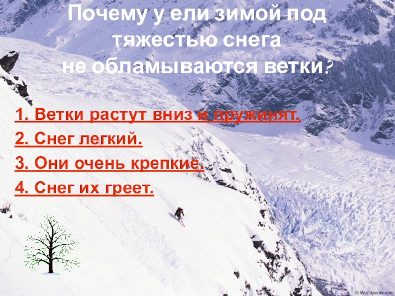 Слайд 4Почему у ели зимой под тяжестью снега не обламываются ветки?
