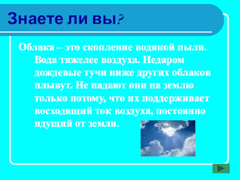 Знаете ли вы?Облака – это скопление водяной пыли. Вода тяжелее воздуха. Недаром дождевые тучи ниже других облаков