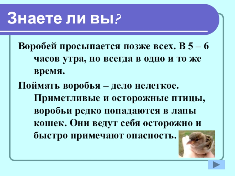 Знаете ли вы?Воробей просыпается позже всех. В 5 – 6 часов утра, но всегда в одно и