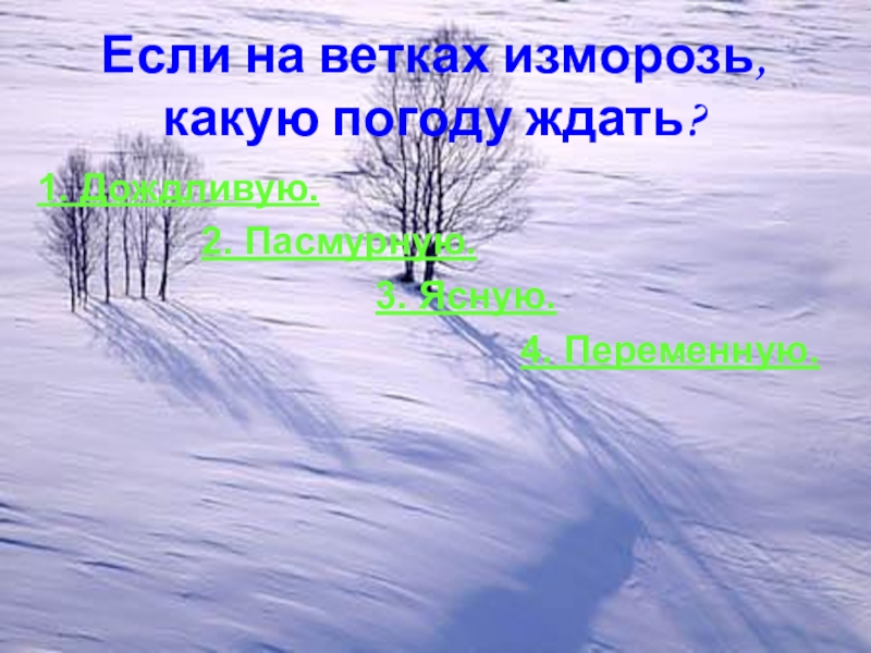 Если на ветках изморозь,  какую погоду ждать?1. Дождливую.
