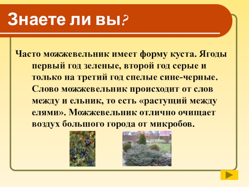 второй год серые и только на третий год спелые сине-черные. Слово можжевельник происходит от слов между и ельник, то есть «растущий между елями». Можжевельник отлично очищает воздух большого города от микробов.